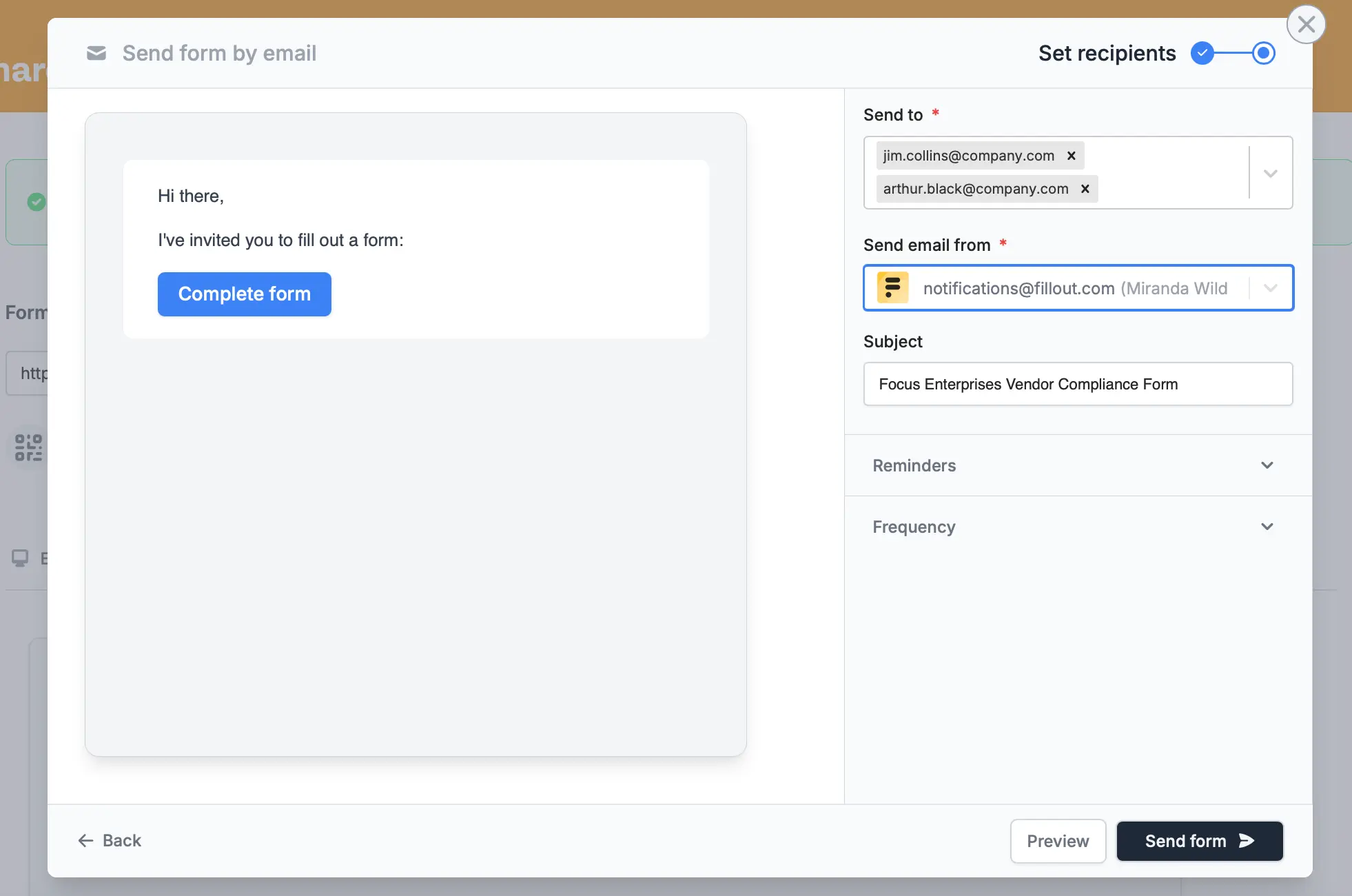 Set recipients and enter the emails of your chosen respondents. Here, you can edit the subject, enable reminders, and choose your preferred frequency. Then, click Send form.