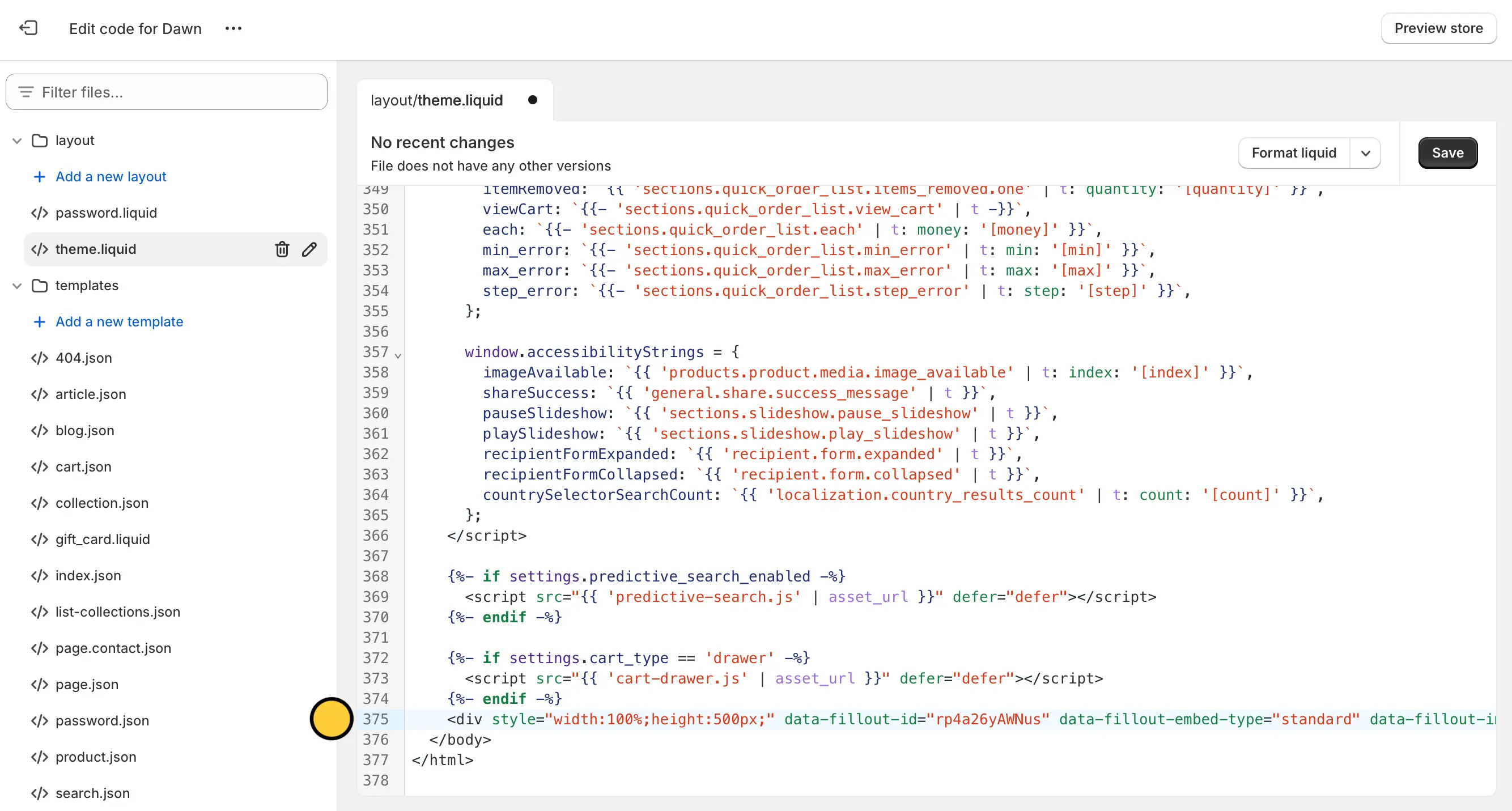 </> theme.liquid from the left-hand panel and paste the embed code of your Fillout form at the top of </body> and </html> tags at the bottom. Then, click Save in the top right.